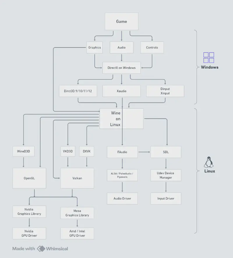 On Linux, Proton (built on Wine) translates these DirectX calls into native Linux equivalents using tools like DXVK (Direct3D to Vulkan) and FAudio (XAudio to SDL). Games using native Linux APIs like Vulkan or OpenGL skip translation entirely, allowing direct interaction with Linux libraries and drivers. This seamless compatibility enables many Windows games to run effectively on Linux.
